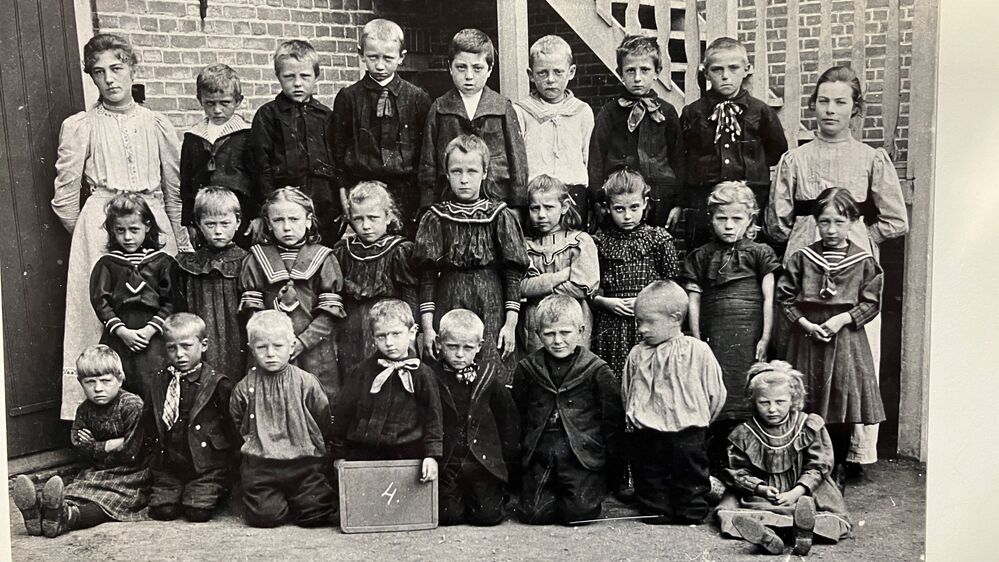 Foto zwart/wit: Lagere school, klassefoto uit 1900 of 1907.Namen Bovenste rij vlnr: Pleuntje Vrij (kwekeling), J Verschoor, T vd Hulst, Leen Kievits, Janus Blom, Toledo, v Woensel, Arie Versluys, Aad Moree (onderwijzeres). Middelste rij vlnr: Arina Moerman, Nellie Stolk, Co vd Veer, Betje de Snayer, Neeltje de Snayer, Neeltje Moermen, v Woensel, Leentje vd Velde, ...