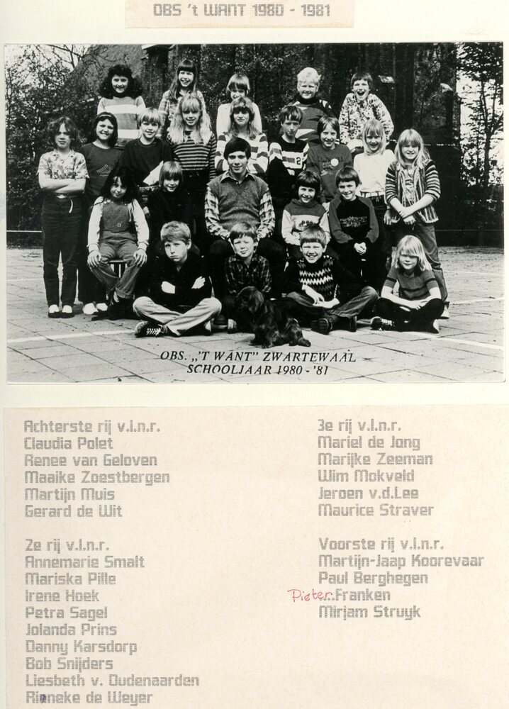 Foto zwart/wit: OBS 't Want, klassefoto. Achterste rij vlnr: C Polet, R van Geloven, M Zoestbergen,M Muis, G de Wit. 2e rij van achter: A Smalt, M Pille, I Hoek, P Sagel, J Prins, D Karsdorp, B Snijders, L vd Oudenaarden, A vd Weyer. 3e rij van achter: M de Jong, M Zeeman, W Mokveld, ...