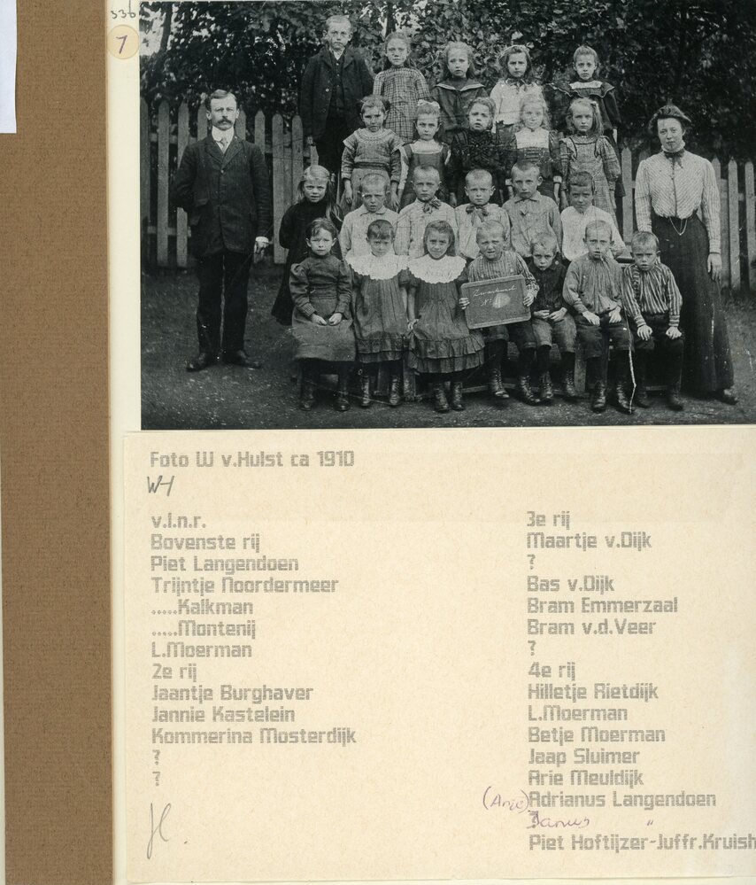 Foto zwart/wit. A fgebeeld vlnr: Bovenste rij: Piet Langendoen, Trijntje Noordermeer, Kalkman, Monteny, L Moerman. 2e Rij: Jaantje Burghaver, Jannie kastelein, Kommerina Mosterdijk, NN, NN. 3e rij: Maartje v Dijk, NN, Bas v Dijk, Bram Emmerzaal, Bram vd Veer, NN. Voorste rij: Hilletje Rietdijk, L Moerman, Betje Moerman, Jaap Sluimer, Arie Meuldijk, Adrianus Langendoen, Piet ...