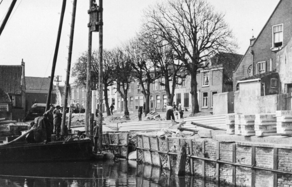 Foto zwart/wit. Reparaties van de oude kademuur in 1952. Op de foto is de oude beschoeiing tezien