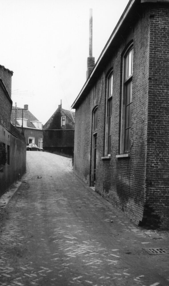 Foto, zwart/wit, Doorkijk naar Noordeinde. Links de achterzijde van Noordeinde 15/17. Rechts de oude openbare lagere school.