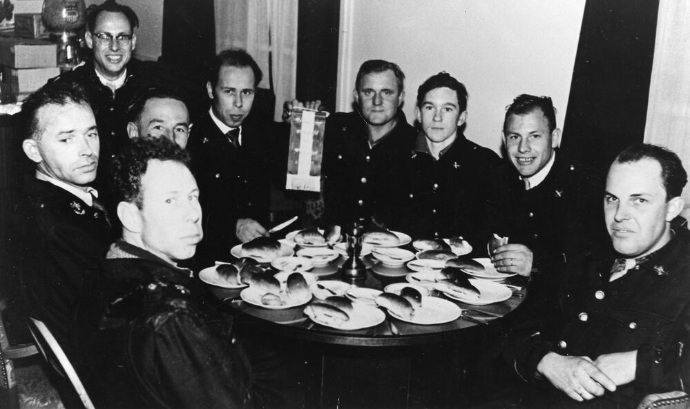 Foto, zwart/wit, Blusgroep Zwartewaal,Vlnr:H vd Hoek, Win Meuldijk, (Halve hoofd van:)Henk Koene, Arie Meuldijk,Henk Sluimer, Arie v d Hoek. Voorgrond links: Piet Meuldijk. Voorgrond rechts Piet Boere