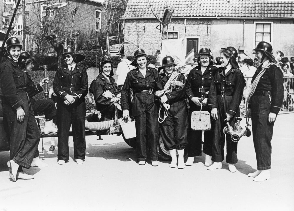 Foto, zwart/wit, "Blusgroep Zwartewaal". De foto is als grap bedoeld. Vlnr: mevr. v d Hoek, mevr Monterij, mevr D vd Hoek, mevr Meuldijk, Mevr Damme, mevr L Boere, Mevr Sluimer, mevr T Meijburg, NN