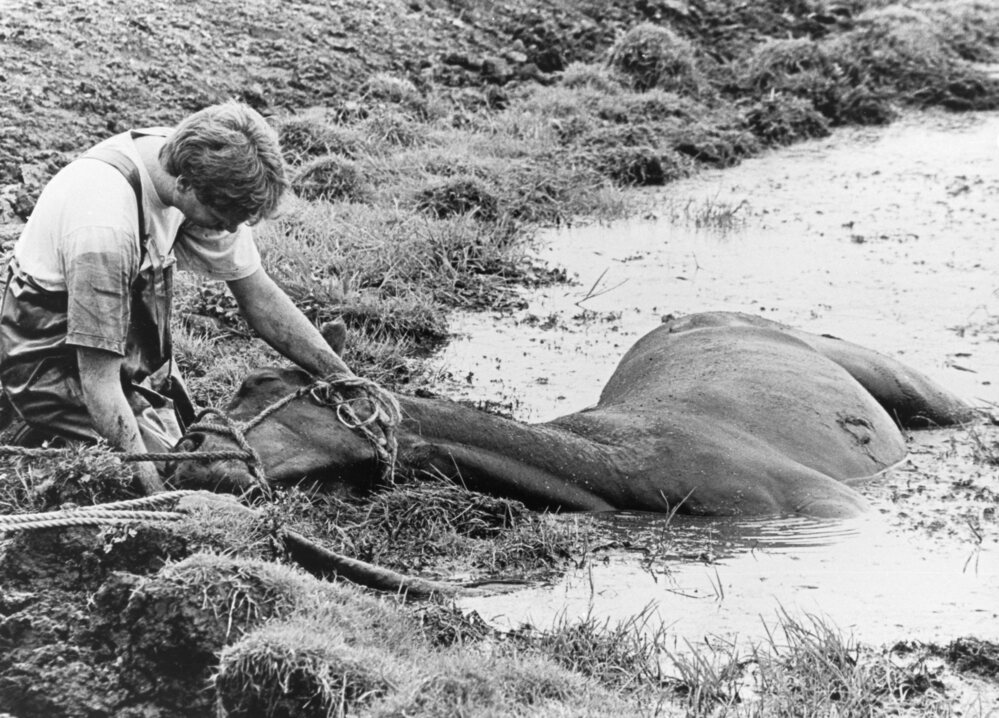 Foto, zwart/wit. Aan de Hollemaarse dijk te water geraakt paard wordt door de brandweer op de kant gehaald.