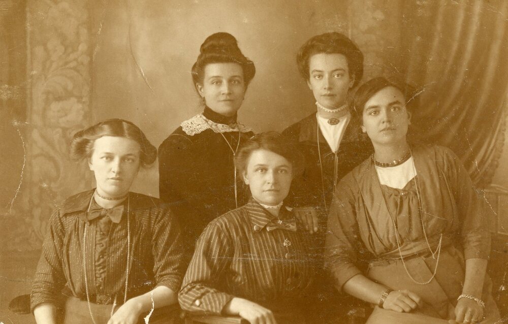 Foto, zwart/wit, Fam v.d. Hoek. bovenste rij vlnr: Geertrui v.d. Hoek, Ko v d Hoek. Voorste rij vlnr: Hester v d Hoek ( 1892-1979) , Neeltje v.d. Hoek, Antje Sliedrecht- vd Hoek
