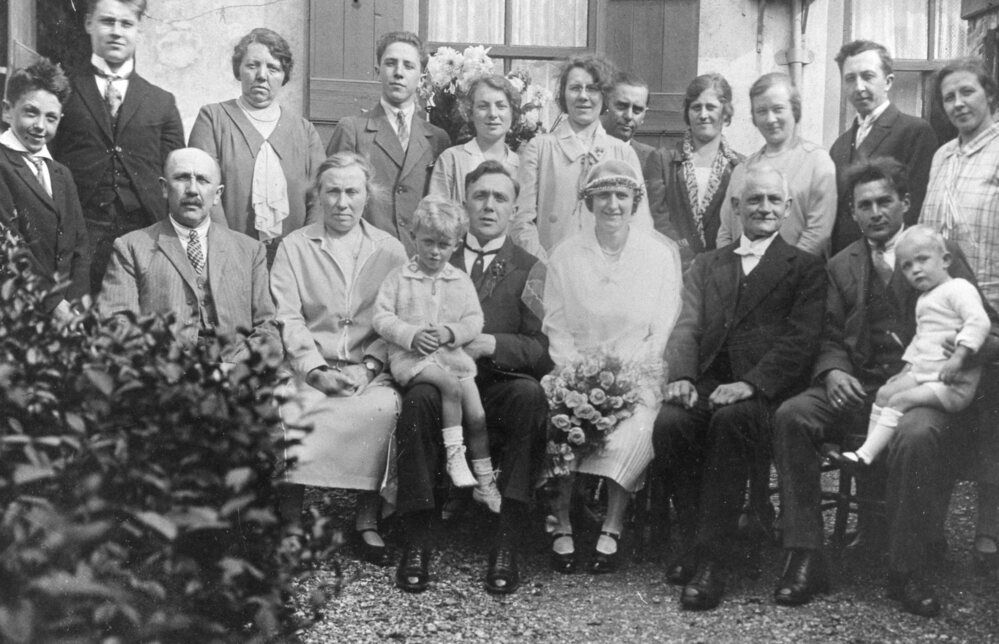 Foto, zwart/wit, Familie de Kievit. Afgebeelde personen bovenste rij vlnr Bram de Kievit, Ds Stolk (vierpolders), Marie v d Belle, Adriaan de Kievit, Anna de Kievit, Wim de Kievit, Hr Verheul, Mevr Verheul, Mevr de Kievit- de Ouden, Mevr Koene- de Kievit. Onderste rij vlnr: P de Kievit, Mw de Kievit-Rodenburg, Kindje Verheul, Jaap de ...