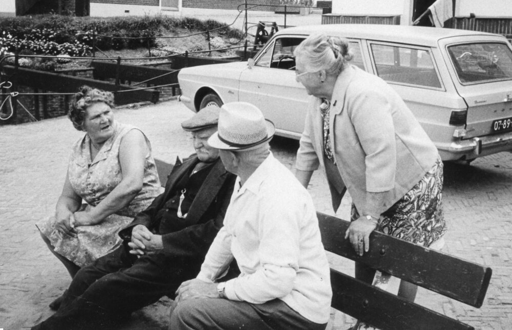 Personen rond bankje op de kade voor zeilmakerij