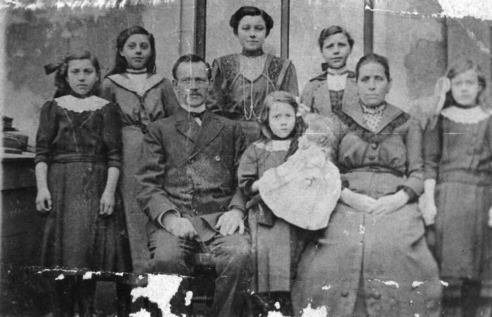 Foto, zwart/wit, De heer Moerman was kleermaker aan het Noordeinde. Behalve de ouders ook op de foto vlnr: Lijntje, Arma, Neeltje, Betje, Stien en Cor