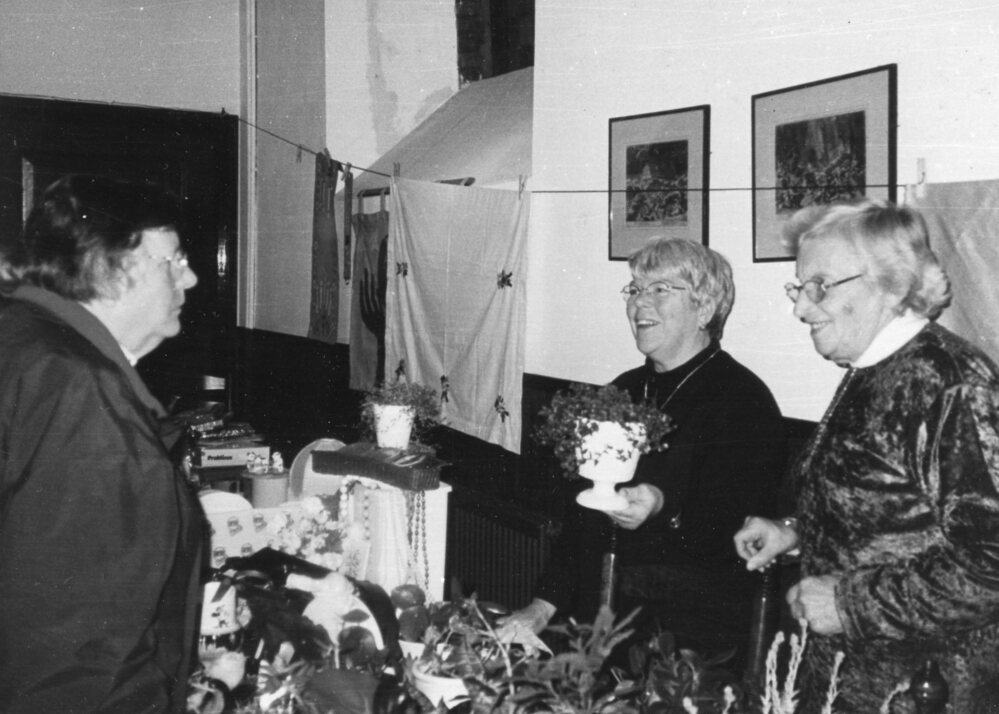 Foto, zwart/wit, van de Kerstmarkt in de Martinikerk. De kraam werd bemand door Mevr Bos (rechts) en Mevr Reems. Voor de kraam mevr Leny Moret