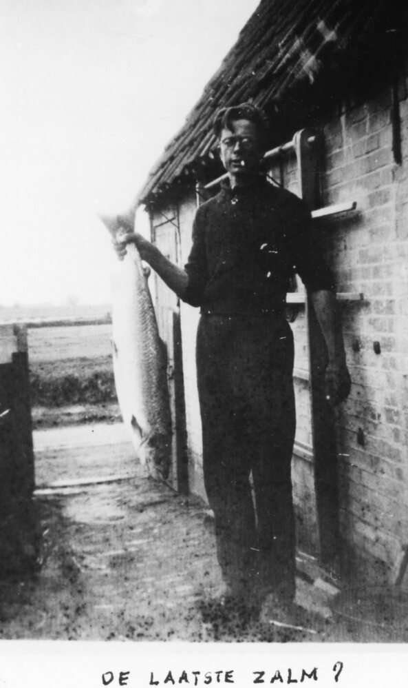 De heer Anton van der Zee, achter de ouderlijke woning aan de haven met de laatst gevangen zalm; 1944