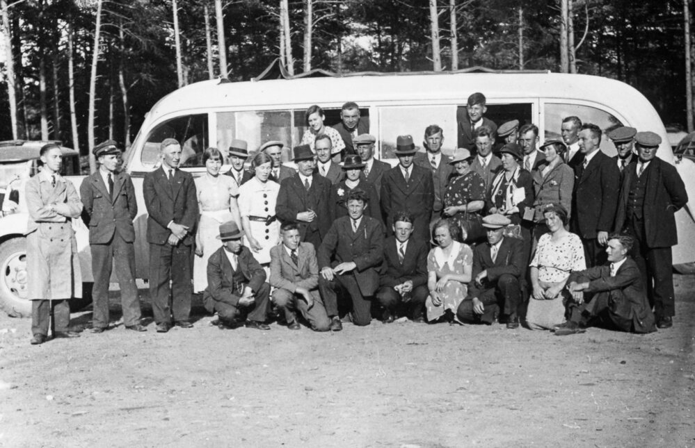 Zwart/wit foto. Bustocht van de zangverening met de eerste bus van Ries Lugtenburg. Met o.a. Heendijk, C de Snayer, den Mol, Dries Poldervaart, Bram Scheygrond met Marie van Hees.