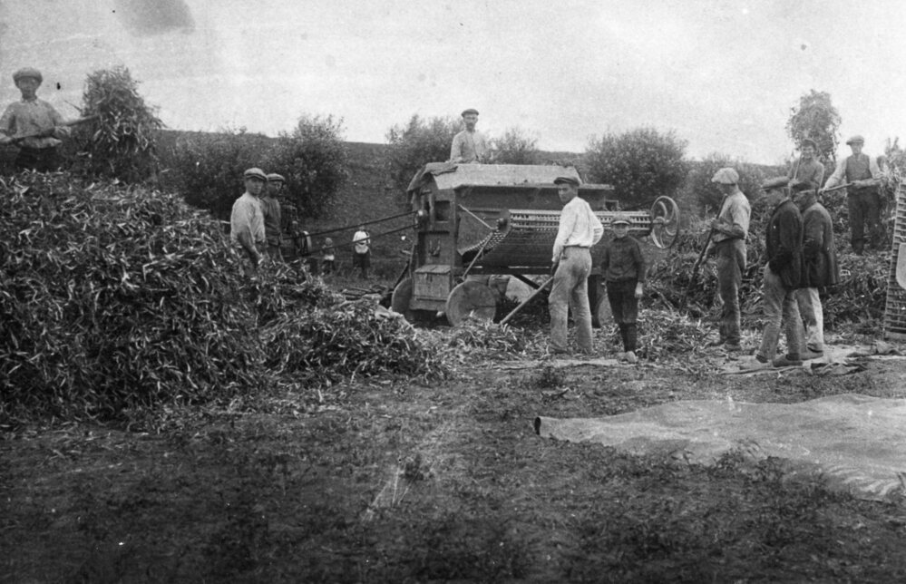 Foto, zwart/wit, Het dorsen van paardenbonen.