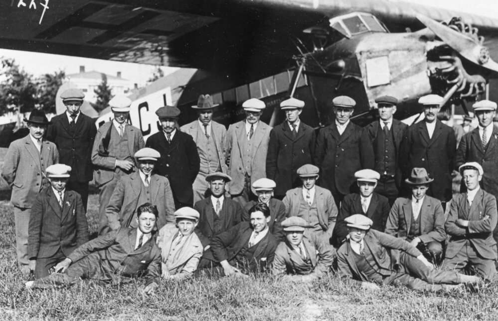 Foto, zwart/wit, Een bedrijfsuitje naar vliegtuigfabriek Fokker. ( bedrijf onbekend )