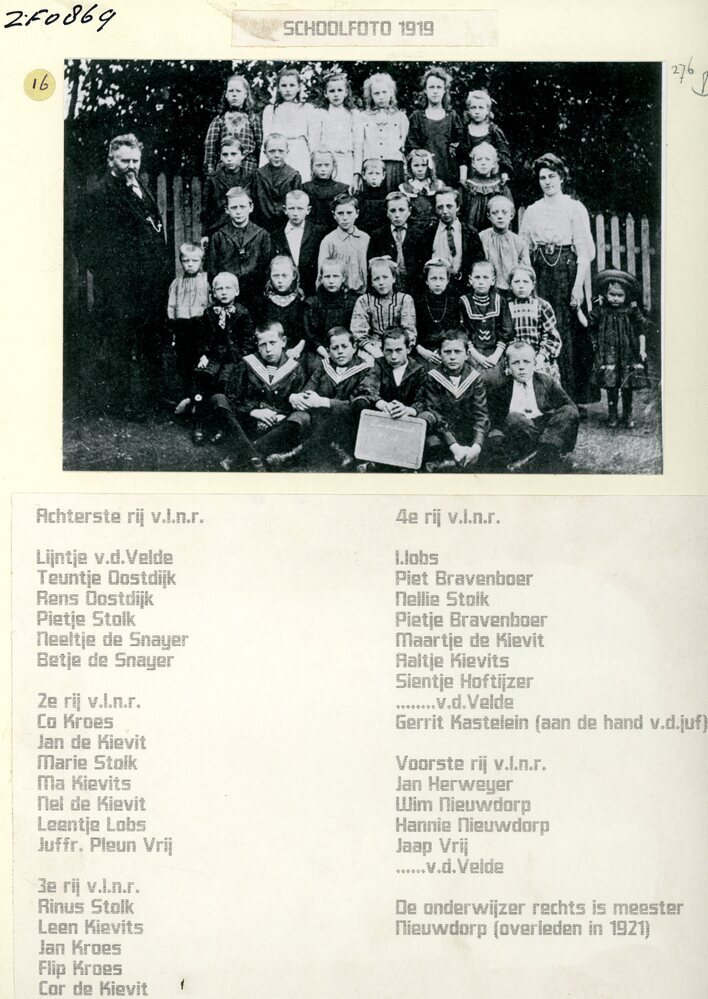 Schoolfoto uit 1919 Achterste rij ( vlnr) : Lijntje v.v. Velde, Teuntje Oostdijk. Rens Oostdijk, Pietje Stolk, Neeltje de Snayer, Betje de Snayer 2e rij (vlnr): Co Kroes, Jan de Kievit, Marie Stolk, Ma Kievits, Nel de Kievit, Leentje Lobs, Juffr. Pleun Vrij 3e rij ( vlnr) : Rinus Stolk, Leen Kievits. Jan Kroes, Flip ...