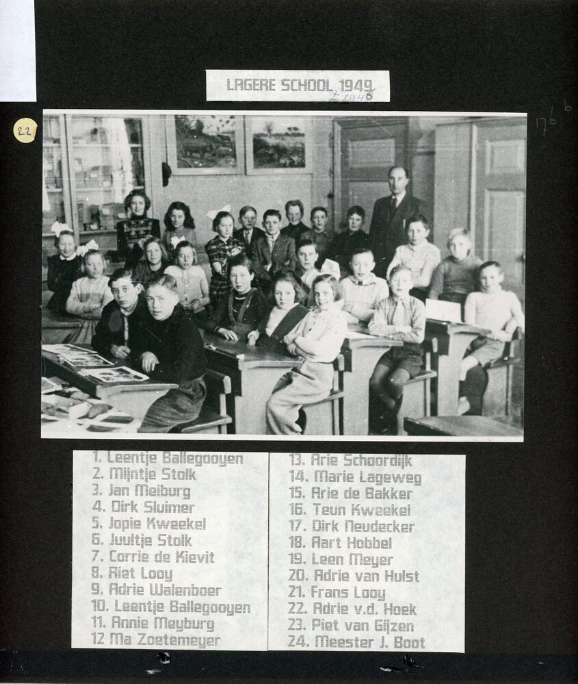 Lagere School. Klassefoto 1949 1. Leentje Ballegooyen , 2. Mijntej Stolk, 3. Jan Meiburg, 4. Dirk Sluimer, 5. Jopie Kweekel, 6. Juultje Stolk 7. Corrie de kievit, 8. Riet Looij, 9. Adrie Walenboer, 10 Leentje Ballegooijen, 11. Annie Meyburg 12. Ma Zoetemeijer, 13. Arie Schoordijk, 14. Marie Lageweg, 15. Arie de Bakker, 16. Teun Kweekel, ...