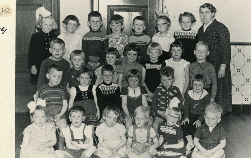Foto zwart/wit: Kleuterschool 1957; Achterste rij v.l.n.r: Janneke v d Kaa, Ada Sluimer, Jan Boers, Krijn Poldervaart, Peter Schoordijk, Marry v d Zee, Willie Kuijt, Juffr Voogt; 2e rij v.l.n.r. Freddie Klootwijk, Crista de Regt, Nel v d Polder, Ina Geilvoet, Ria Scheijgrond, Nel van Trigt, Arie v d Bergh;3e rij v.l.n.r Paul v d ...