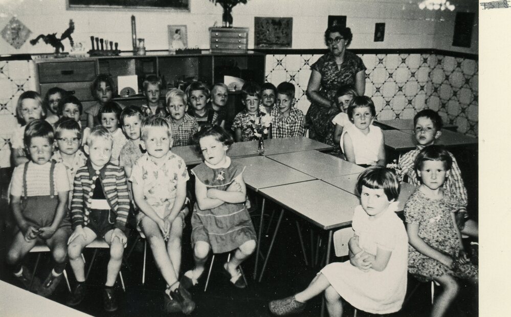 Klassefoto kleuterschool 1957. Achterste rij v.l.n.r. ?, ?, ?, Arentje Stolk, ? , Leen Sluiter, Atie Geilvoet, Simon v d Polder, Hanny Hobel, ?, Leen Moerman, Juffr Voogt; Linkerkant tafel vlnrn Sjaak van Damme, Peter Looij, Albert Schuurhuis, Koos Meuldijk, Jaco Looij, Nel Monteny; Rechts van tafel: ?, Ditje Luijendijk, Karel v d Wel, Marion ...