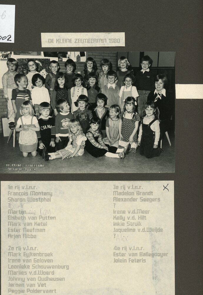 Klassefoto "de Kleine Zeemeermin 1980"Afgebeeld:Achterste rij v.l.n.r: Francois Monteny, Sharon Westphal, ?, Martijn .., Elsbetgh van Putten, Mark van Ketel, Ester Reefman, Arjan Ribbe; 2e rij v.l.n.r: Mark Eijkenbroek, Irene v Geloven, Leonieke Schouwenburg, Marlies v Woerd, Johnny v Oudheusden, Jeroen v Vet, Peggie Poldervaart, Suze Mol; 3e rij v.l.n.r: Madelon Brandt, Alexander Seegers, ?, ...