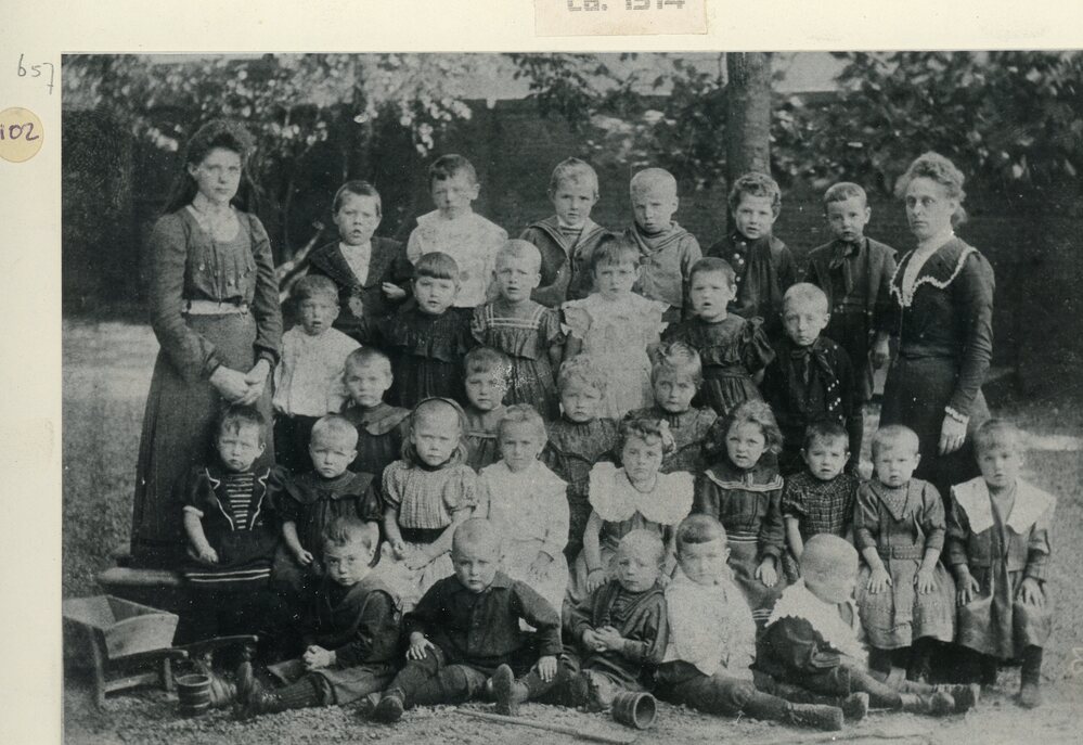 Klassefoto 1914, De leerlingen van Juffr Bak (uiterst recht) en Hulp Betje Koene (uiterst links).