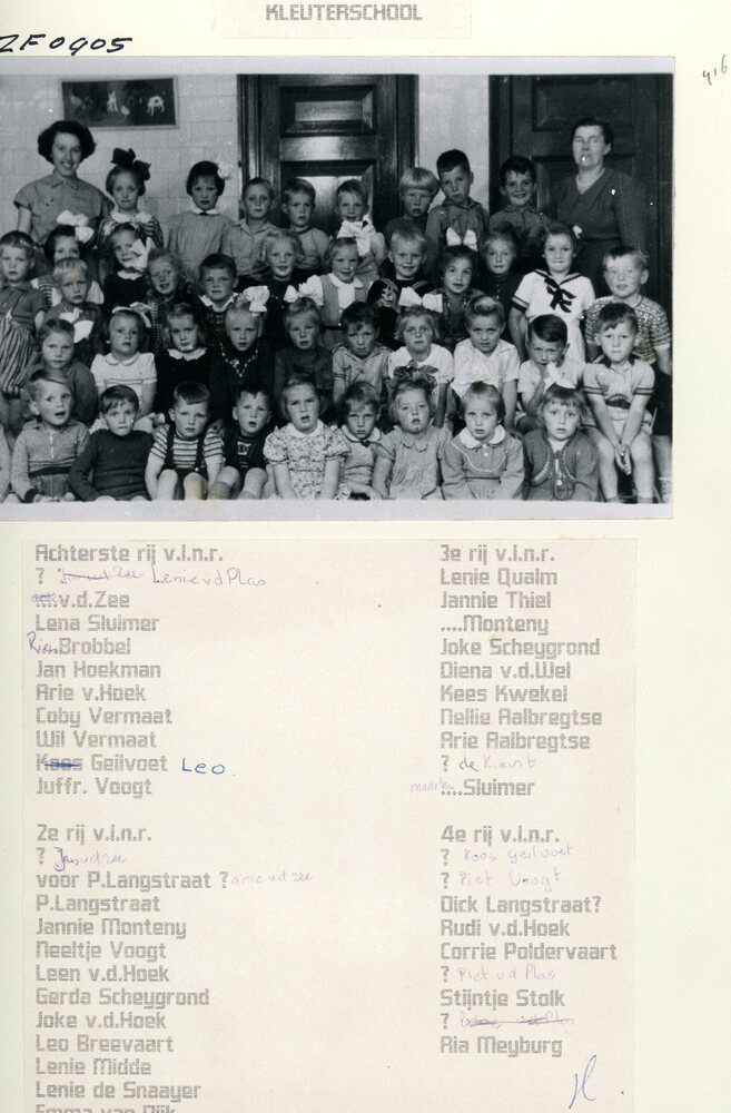 Klassefoto kleuterschool 1940; Achterste rij v.l.n..r.: Lenie v d Plas, v d Zee, Lena Sluimer, Rien Brobbel, Jan Hoekman, Arie v d Hoek, Coby Vermaat, Wil Vermaat, Leo Geilvoet, Juffr. Voogt; 2e rij v.l.n.r.: Jan v d Ze, Arie v d Zee, P Langstraat, Jannie Monteny, Neeltje Voogt, Leen v d Hoek, Gerda Scheijgrond, Joke ...