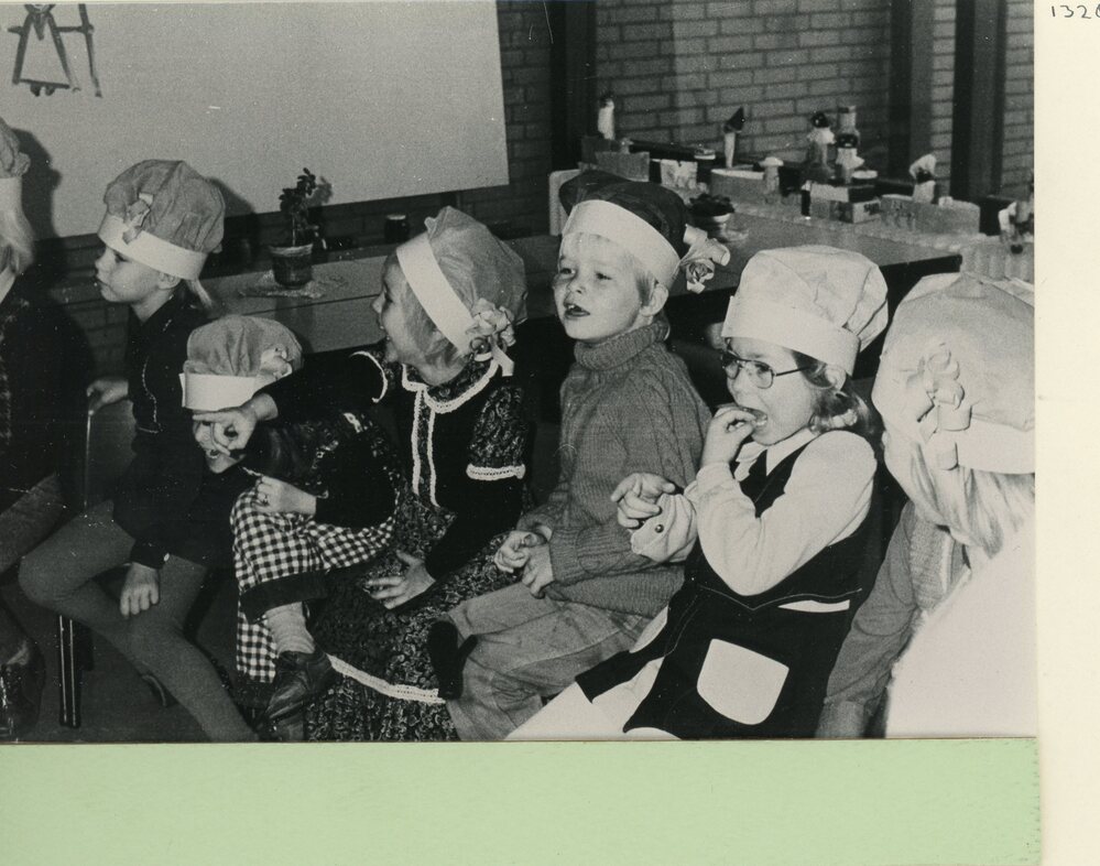 Kleuterschool 1974, zittende kleuters met feestmutsen op.