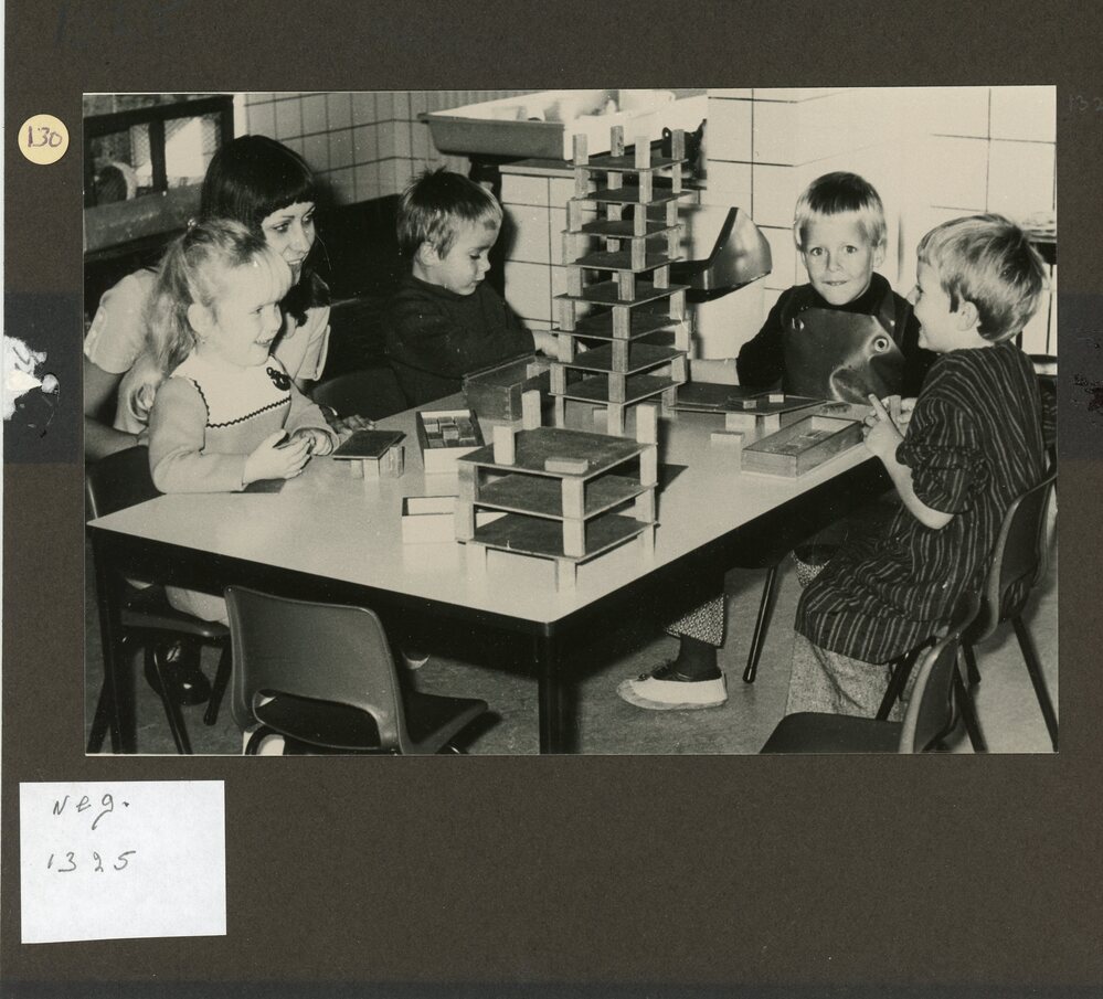 Kleuterschool 1974, groep kinderen bouwt met de juf aan tafel een houten toren.
