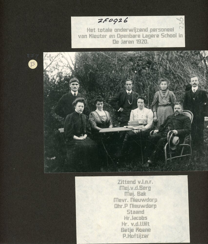 Foto, zwart/wit, Familie foto ca 1905-1907: Staand v.l.n.r: Kommer in't Veld, Juff A.A. Moree,? ; Zittend v.l.n.r.: Mevr A A Nieuwdorp-Neecken, Wim Nieuwdorp, ? , Mien Koene.