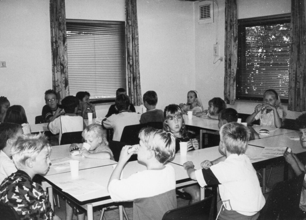 Foto, zwart/wit, Kinderkerk, Groepje kinderen aan tafeltjes.