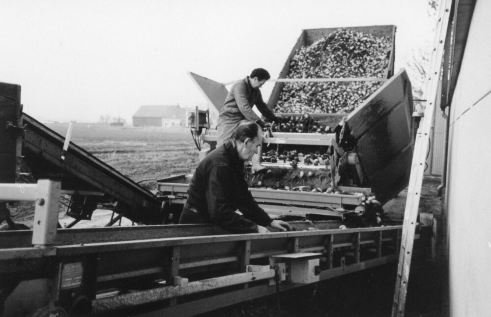 Foto,zwart/wit, Aardappelen sorteren Molendijk. zie ook bijlage .
