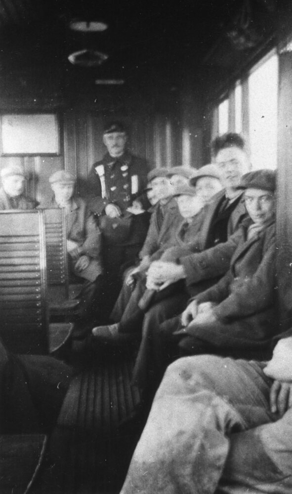 Foto, zwart/wit,Binnenkant van 2e klasse R.T.M. rijtuig ca. 1930. De conducteur is Dhr. Mourits uit Oostvoorne