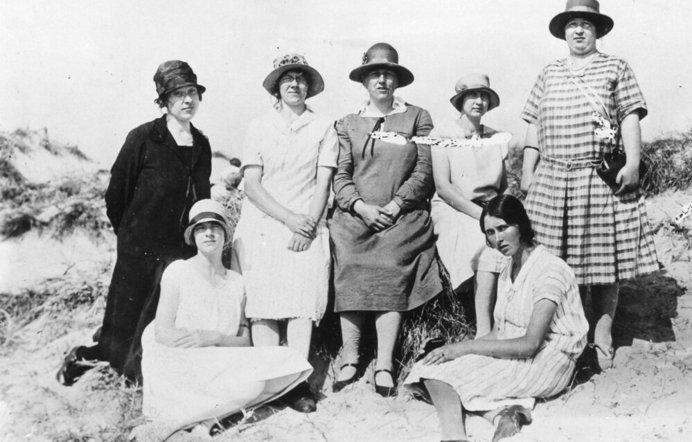 Foto, zwart/wit. Groepsfoto. Een stel dames aan het strand.