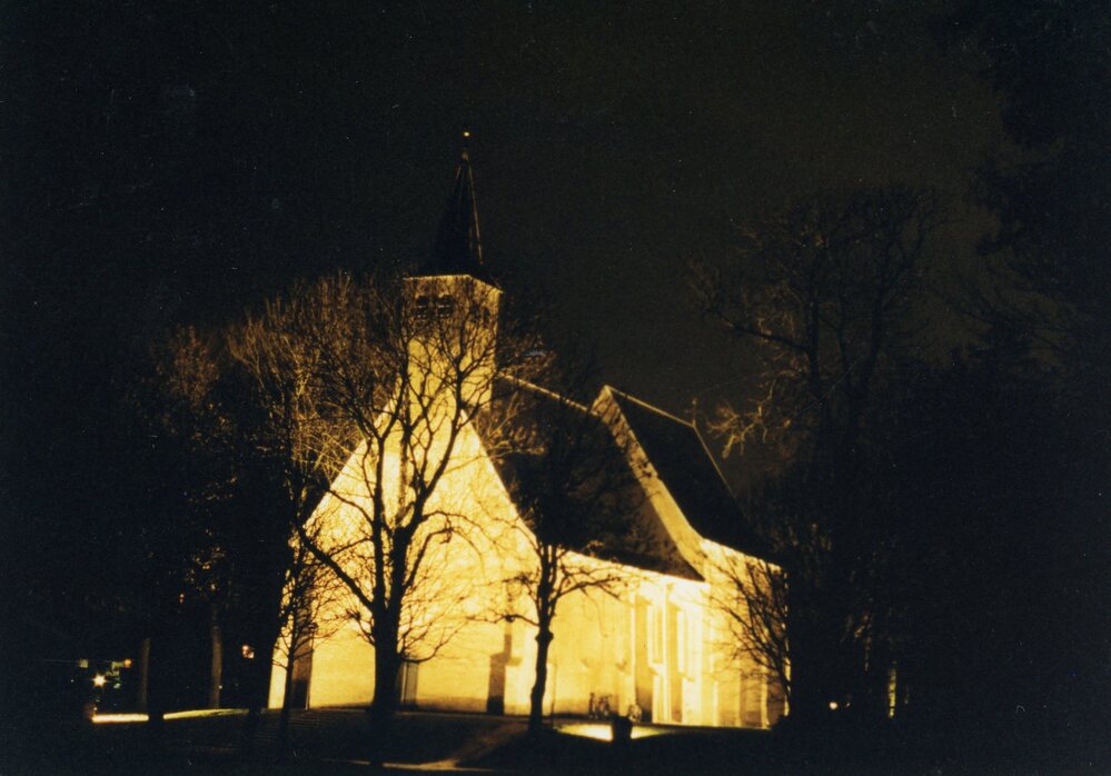 Foto, kleurenfoto, N.H Kerk avondverlichting