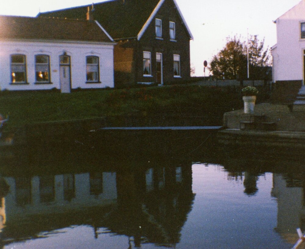 Foto,Kleur, De uitwateringssluis van de haven. Links het witte huis van De Goede, daarnaast de boerderij van Monteny. Rechtvoor het woonhuis van de fam. v. Hulst