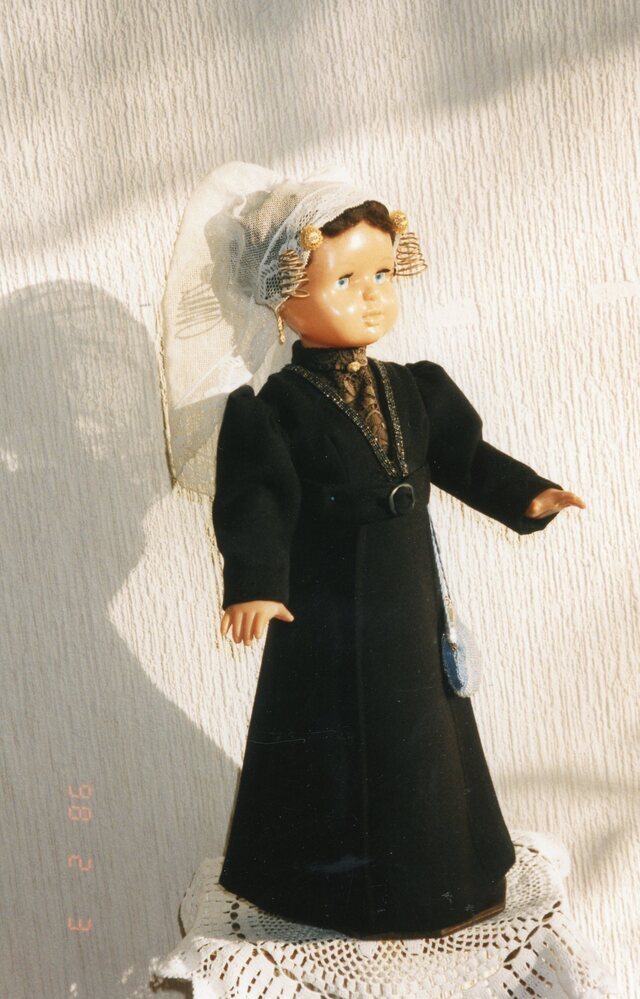 Foto: kleuren, Pop in klederdracht, gebruikt tijdens tentoonstelling. De pop werd gemaakt door Mevr. Hoekman. Zie ook ZF1499