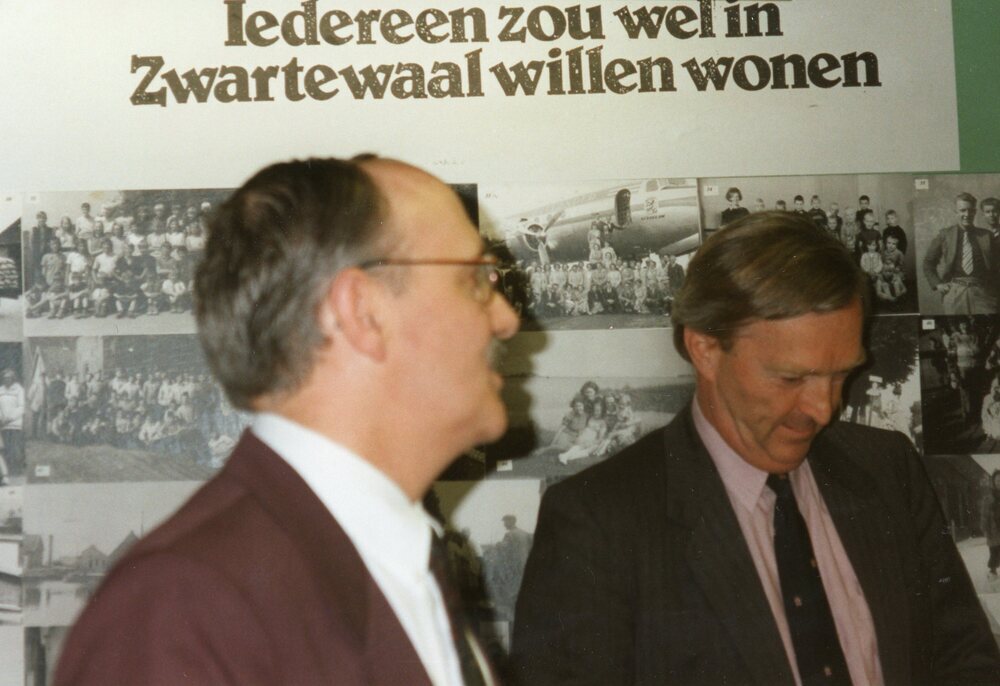 Foto: kleur, de Heer Piet Voogd met bezoeker voor een bord van de tentoonstelling.