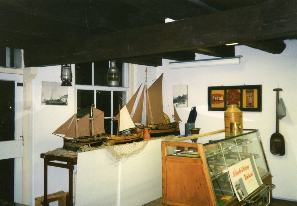 Foto: kleur, interieur tentoonstelling met vitrine en scheepsmodellen.