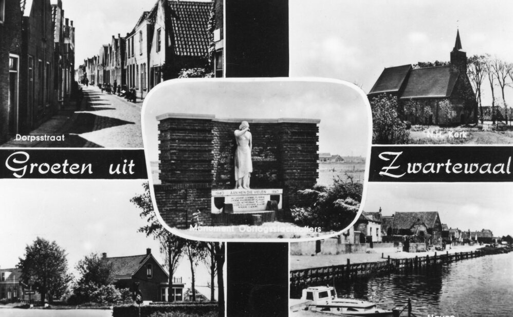 Een anschtskaart van Zwartewaal met verschillende onderdelen zoals de Dorpsstraat, de Kerk, het Monument voor de gevallenen, de haven en het begin van het dorp bij de Groenekruisweg.