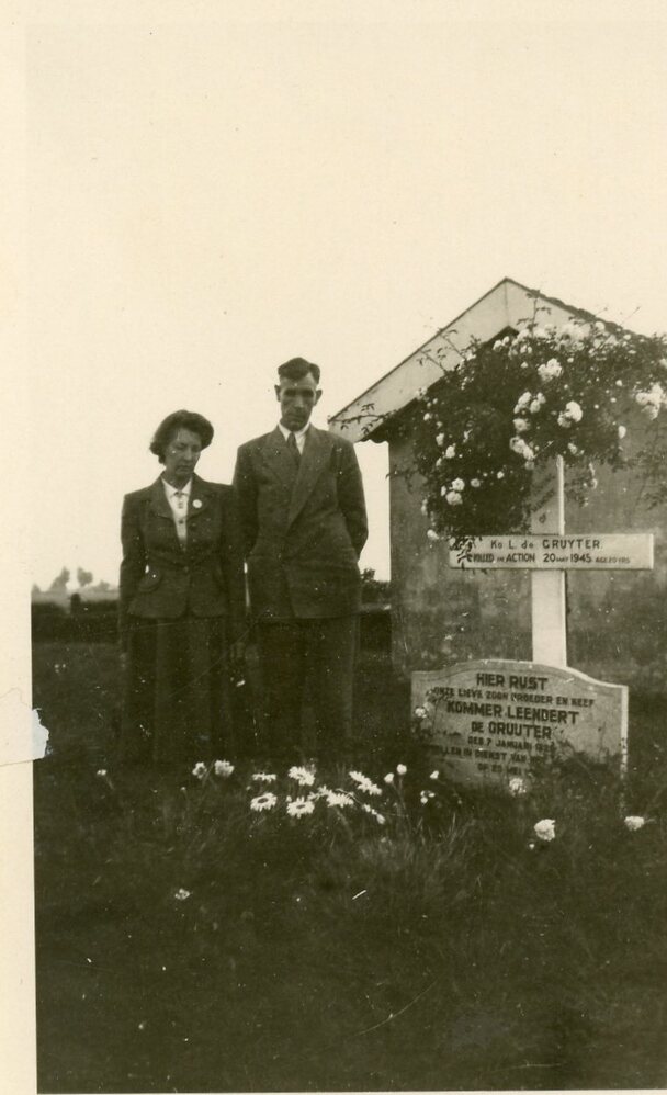Foto,zwart/wit, Echtpaar bij graf van Ko L de Gruyter, killed in action.