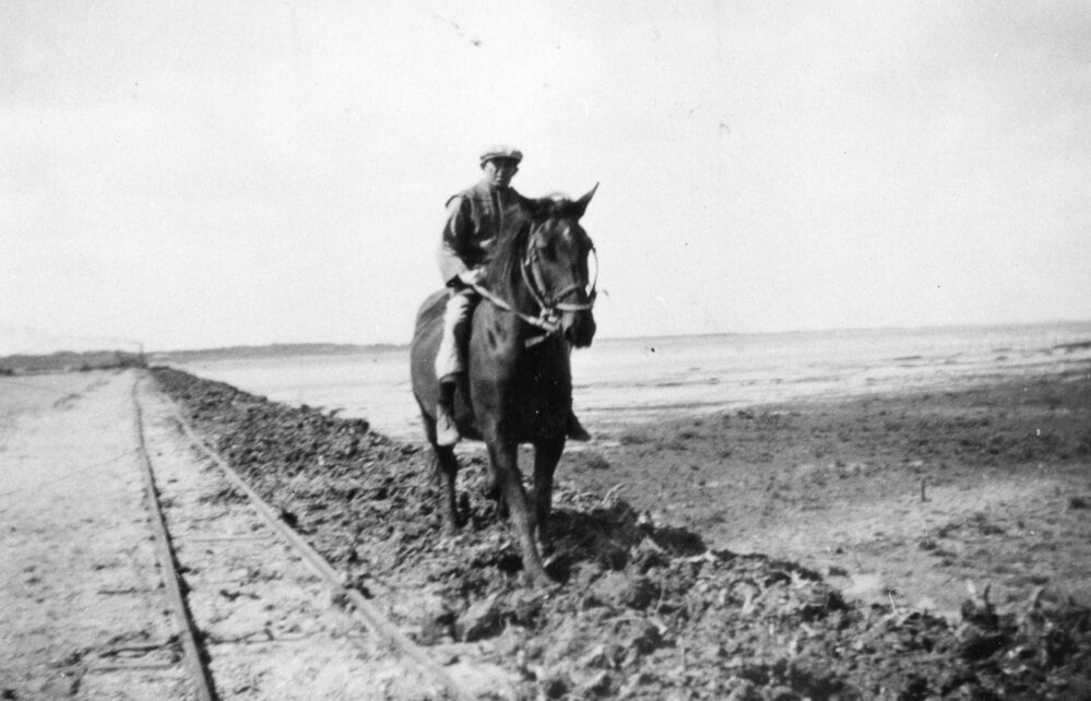 Foto, zwart/wit, Ruiter te paard, bezig met het "kleitrappen". Dit gebeurde vaak op zeedijken.