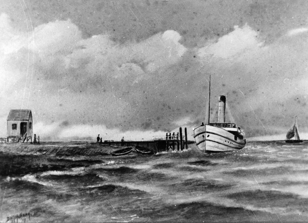 Foto, zwart/wit van schets van veerboot aan het havenhoofd anno 1917