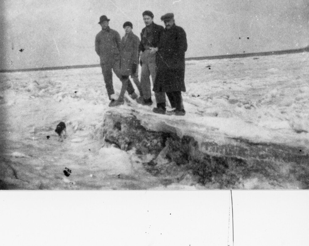 Foto, zwart/wit, Groepvan 4 mannen in winterlandschap.