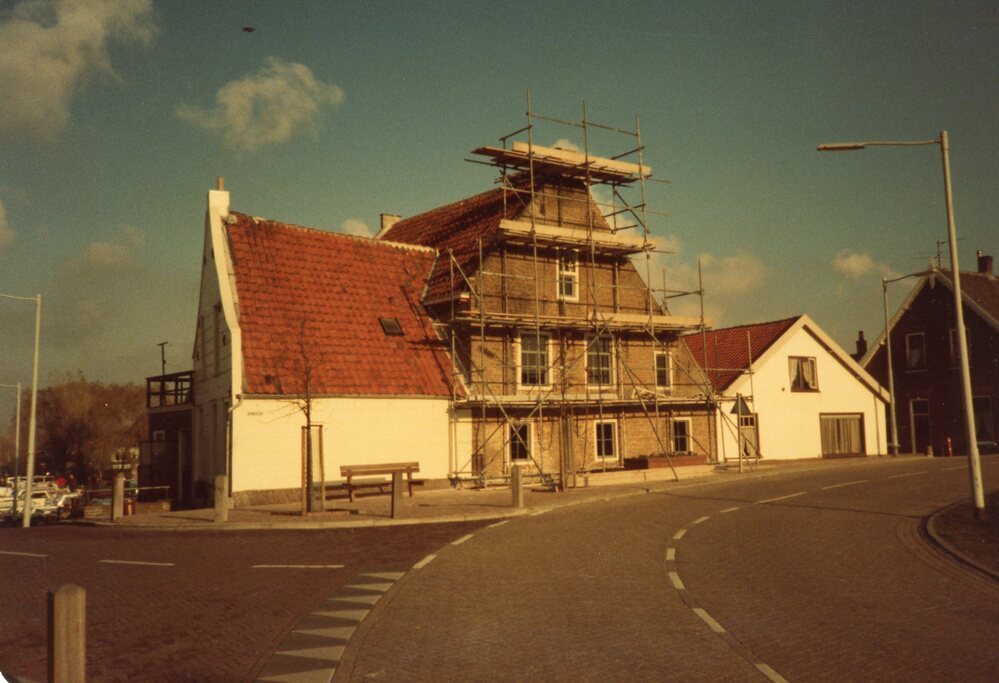foto kleur, Zeilmakerij stellage aan de zuidzijde van de gevel.