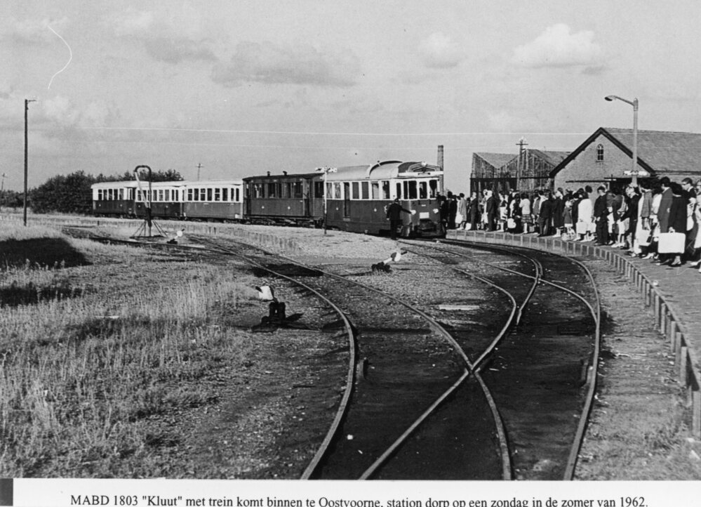 Foto, zwart/wit,MABD 1803 "KLuut"met trein komt binnen te Oostvoorne, station dorp op een zonnige dag zomer 1962.