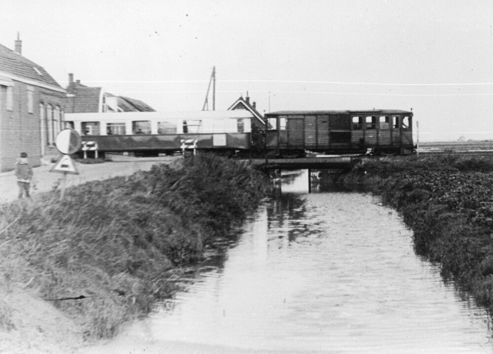 Foto, zwart/wit, Oversteek van de Hollandscheweg te Oudenhoorn. Vervolgens kwam de Oudenhoornse Molendijk.Vóór 1928 mochten de trams uit Hellevoetsluis deze dijk passeren met een snelheid die niet hoger was dan 12 km per uur.