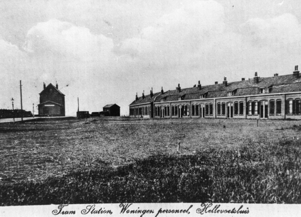 Foto, zwart/wit, Hellevoetsluis tramstation. Naast het station bevonden zich diverse tramhuizen waarin personeel van de RTM met hun gezinnen woonden. In de Tweede Wereldoorlog werden deze woningen afgebroken. Op dezelfde plaats werd een opstelterrein aangelegd voor voertuigen die met de veerboot naar Middelharnis moesten.