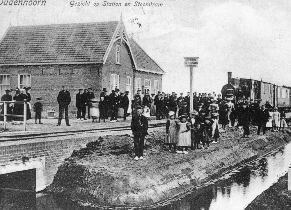 Foto, zwart/wit, Oudenhoorn Gezicht op station en stoomtram omstreeks 1910.
