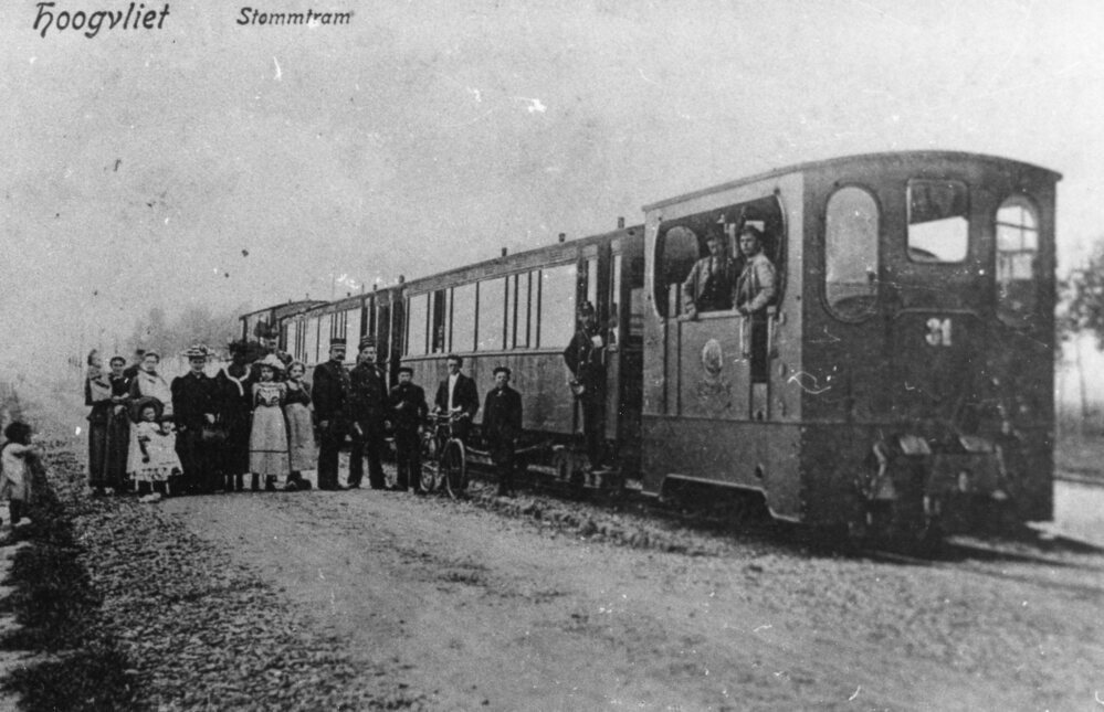 ansichtkaart, zwart/wit, stoomtram met een zo genaamde "brokkendoos" er voor op station Hoogvliet.