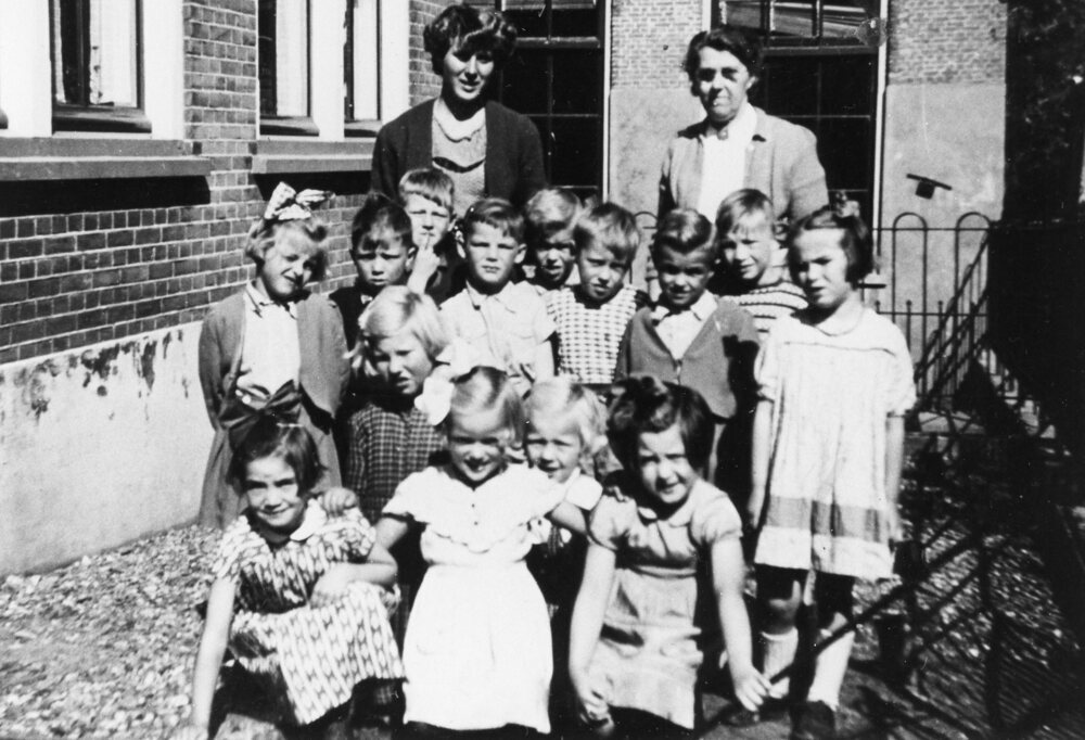 Foto zwart/wit: Kinderen en onderwijzeressen van de kleuterschool 1950.Voorste rij v.l.n.r: Leny Midde, Sjanneke Langstraat, Gerda Scheijgrond, Plonie Wolters. 2e rij: Nel Aalbregts, Coby Vermaat, Leen v.d. Hoek, Arie Aalbregts, Corrie Poldervaart. Daarachter Kees Kwekel, Jan Hoekman, Arie v.d Hoek.Links Juffr Janna en rechts Jufr Voogt.