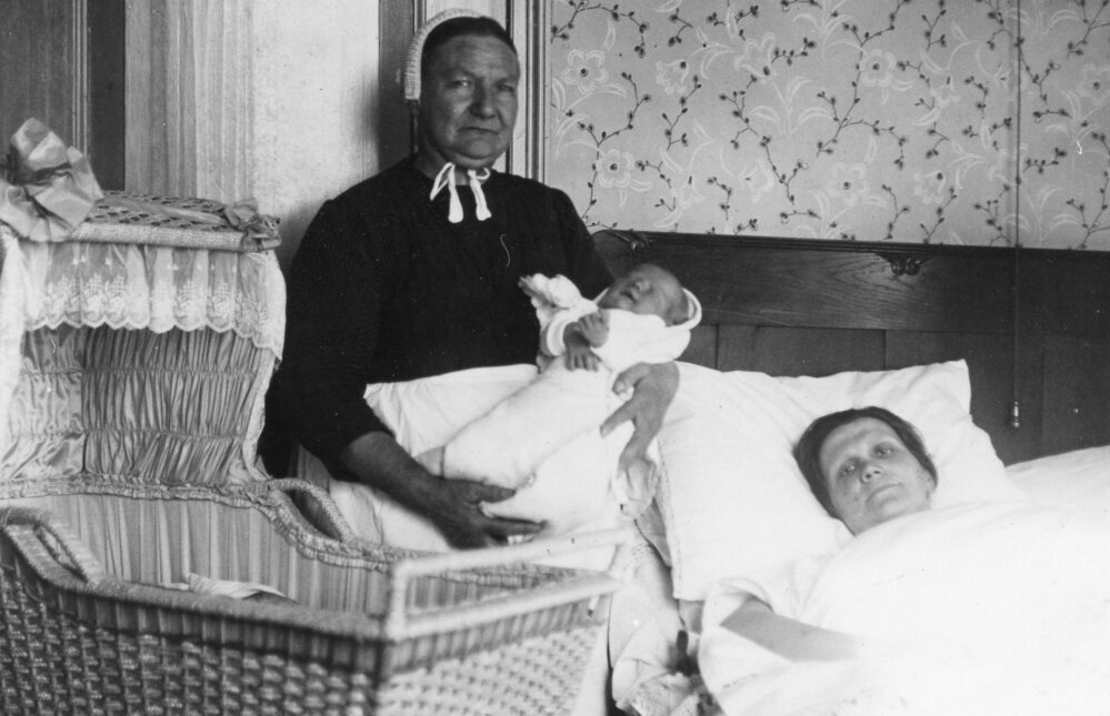 Foto, zwart/wit, Baakster in traditionele kledij met gebakerde baby op schoot en de moeder van de baby in bed.