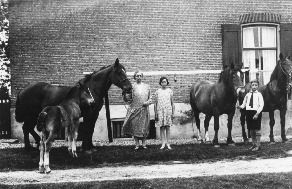 Foto, zwart/wit, Familie met paarden staande voor een boerderij Dorpsstraat.